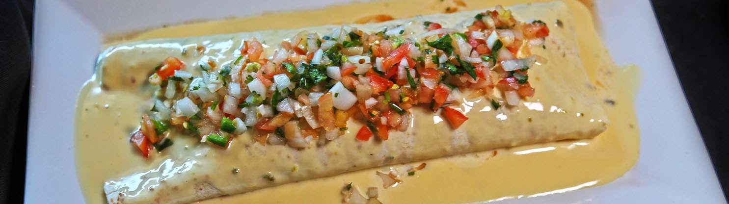 Extra big burrito stuffed with black beans, rice, guacamole, pico de gallo and covered with cheese dip. BURRITO CANCÚN 19.99 Extra big burrito filled with grilled shrimp, bell peppers and onios, topped with cheese dip. Served with rice.