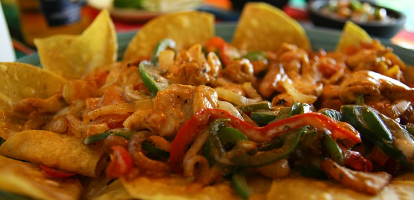 Cheese nachos topped with ground beef or chicken, beans, lettuce, tomatoes and sour cream.