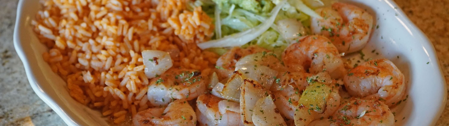 Shrimp with grilled onions and exquisite Mexican garlic sauce. Served with rice and guacamole salad.